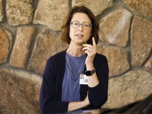 Abigail Johnson, CEO of Fidelity Investments, delivering a speech at a global finance event